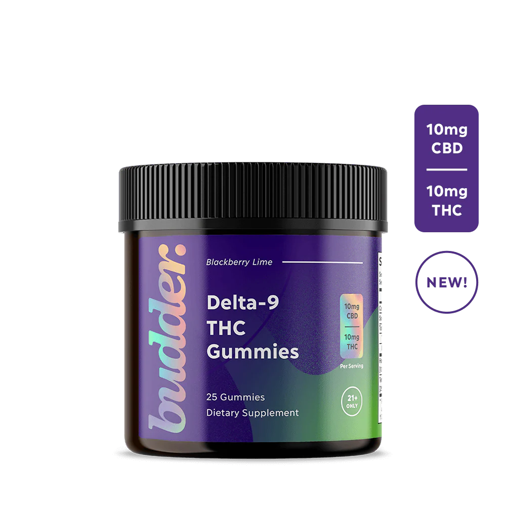 Budder’s highest strength gummy is definitely one for the THC connoisseurs. With the perfect blend of blackberry and fresh lime along with 10mg of Delta-9 THC and 10 mg of CBD, these Delta 9 gummies pack a punch.